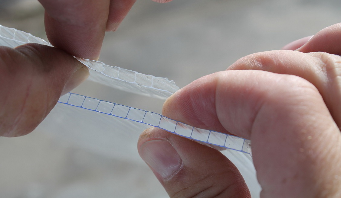 *средний слой – это пустотелые ячейки , за счет которых сильно облегчается вес поликарбоната. Эти ячейки служат хорошей теплоизоляцией , а стенки этих ячеек – это ребра жесткости , которые придают листу повышенную прочность.